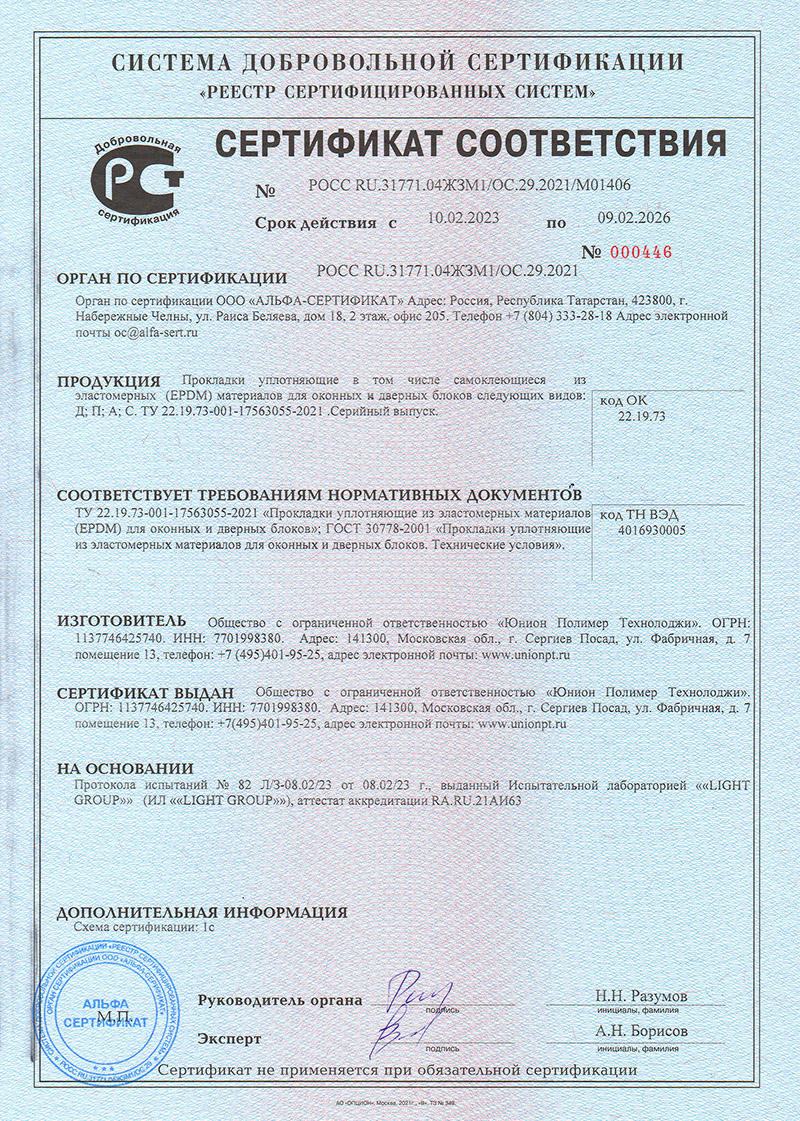 Сертификаты о соответствии уплотнителей EPDM
